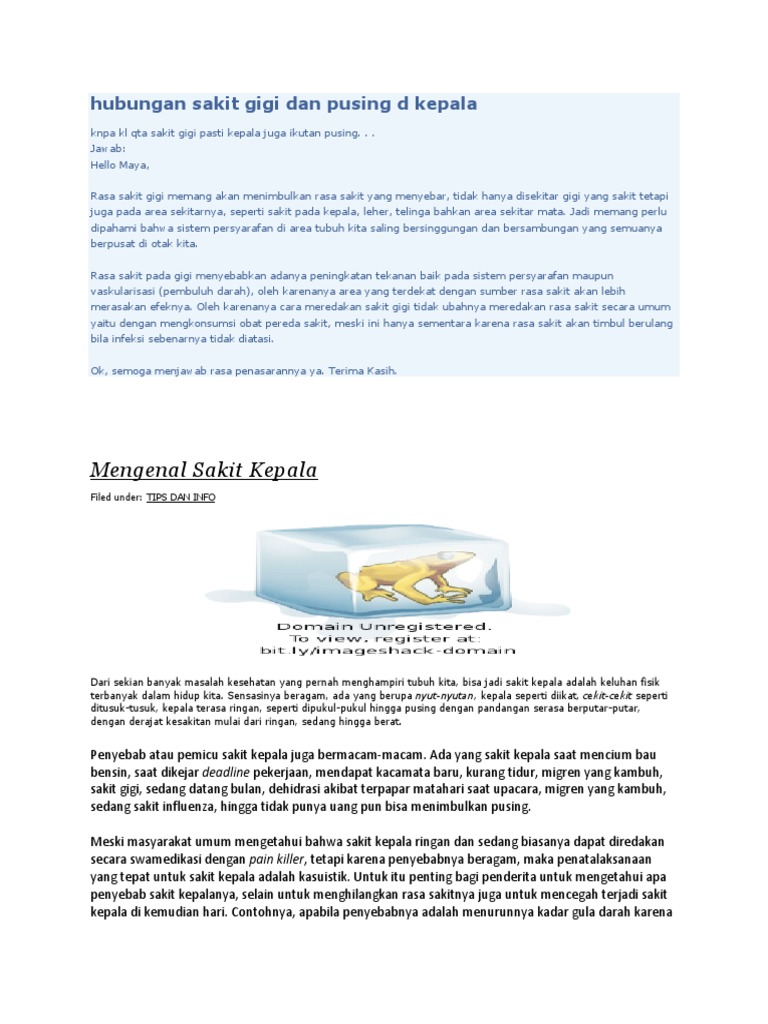 Sakit kepala sebelah kanan dapat disebabkan oleh begitu banyak hal yang terkadang sulit untuk didiagnosis. Sakit punggung sebelah kanan atas bisa disebabkan oleh banyak hal. Sakit leher sebelah kiri 8 hal ini bisa jadi penyebabnya. Sakit kepala sebelah kanan yang ringan umumnya bisa sembuh dalam hitungan menit sampai jam. Sakit kepala sebelah atau migrain adalah sakit kepala yang terasa berdenyut pada satu sisi kepala.